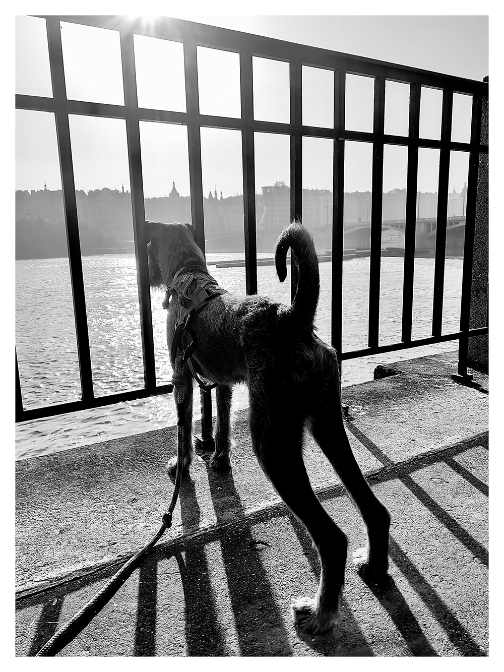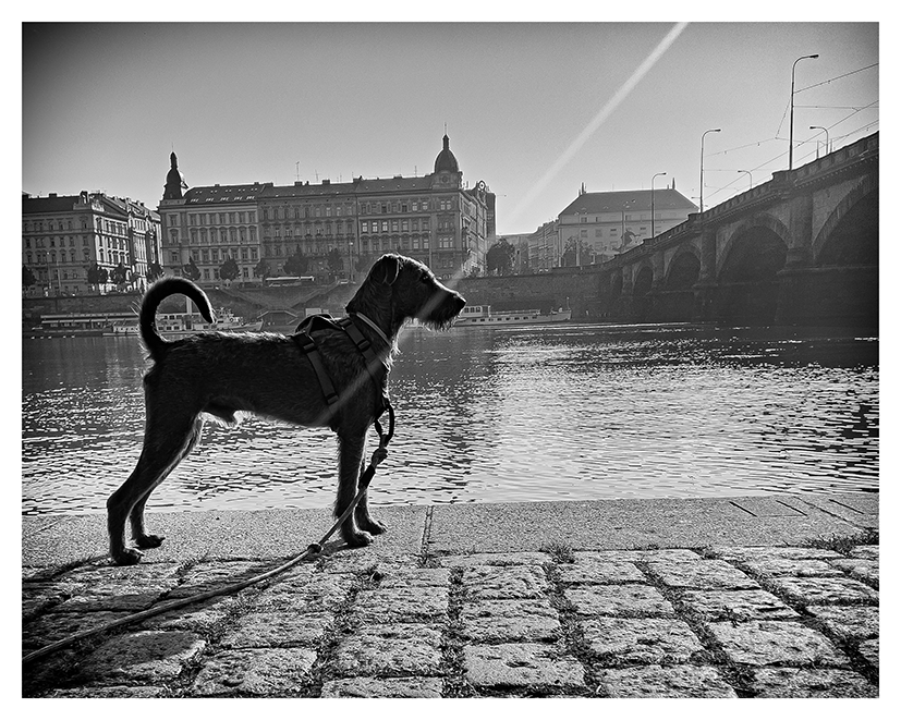 Irish Terrier František Puma liebt Prag. Der Geruch, die vielen Parks, die Moldau mit den vielen Schwänen wecken in ihm die Entdeckerlust. Es war ein warmer Sommertag mit sehr hellem Licht. Die Kulisse im Hintergrund zeigt das Dancing House und das Emaus.