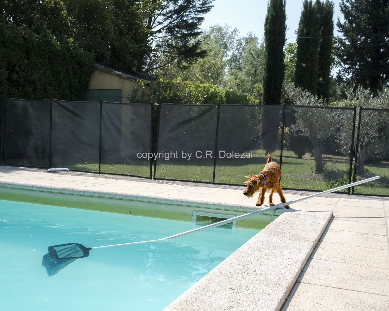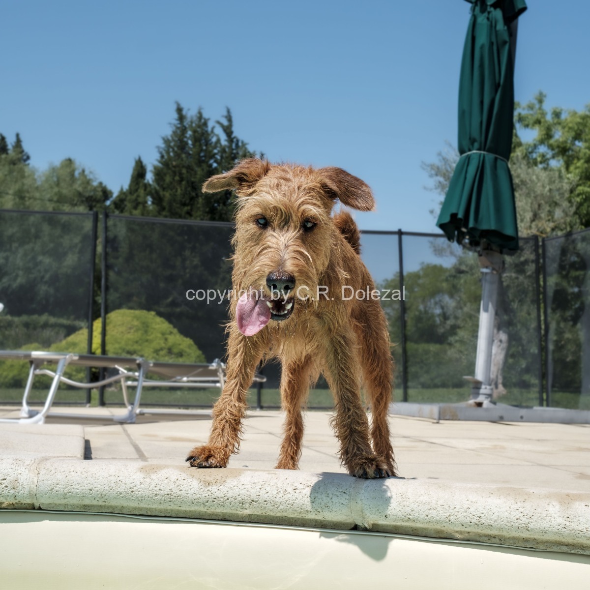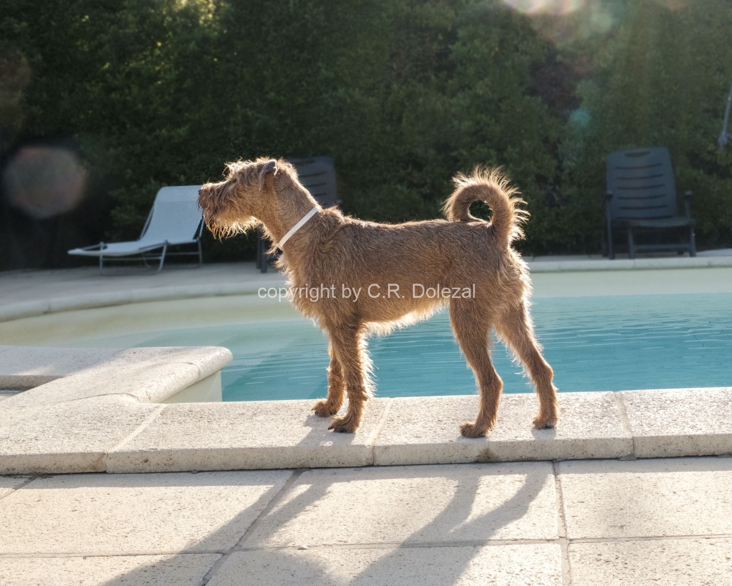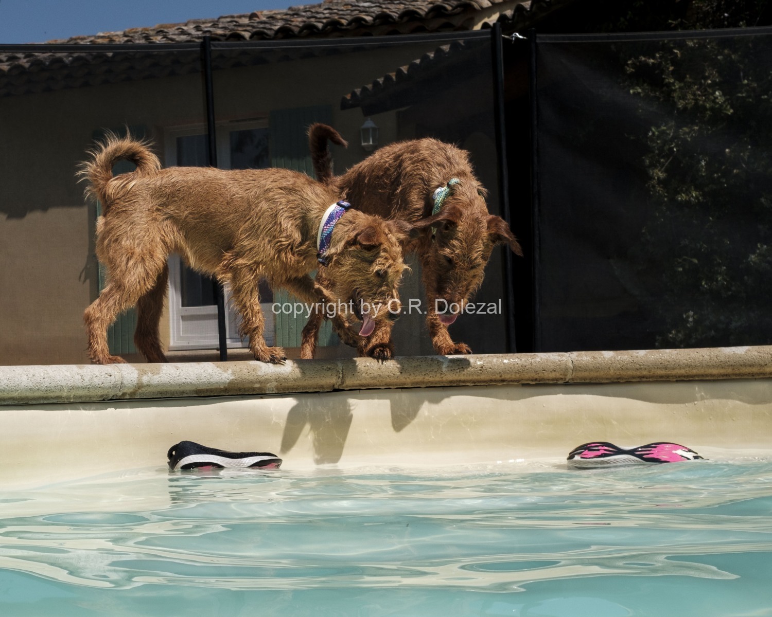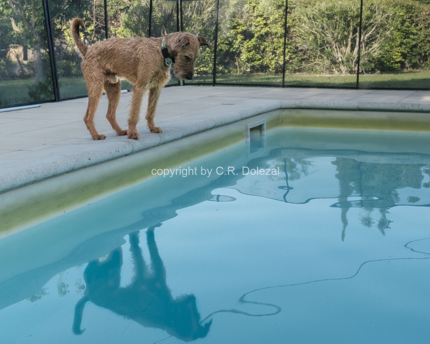 Die beiden Irish Terrier František Puma und seine Schwester Ambra sind fasziniert von Lichtspiegelungen und Gegenständen im Wasser.