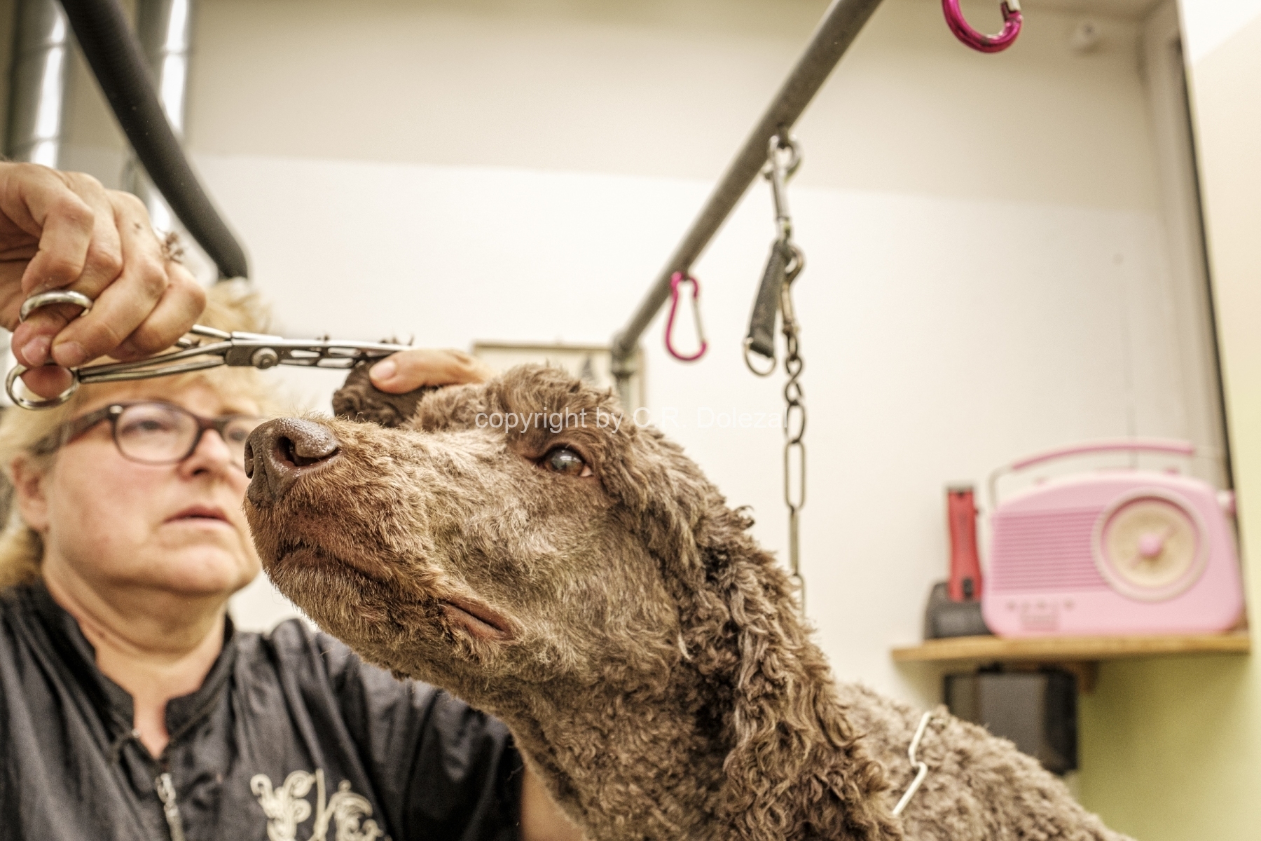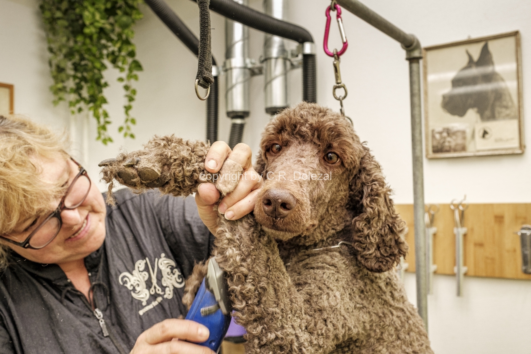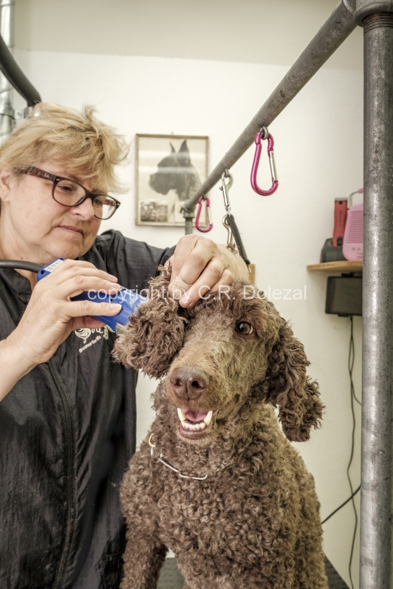 Beim Besuch eines Hundesalons erhielt einen Blick auf die anstrengende Arbeit einer Hundecoiffeuse und die Herausforderungen, welche Mensch und Hund haben. Die abgebildete Grosspudel-Hündin war sehr kooperativ und liess sich routiniert ihre Krallen schneiden und ihr Fell scheren.